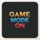 Das Design enthält den Begriff "Game Mode On" in einem fett formatierten, serifenlosen Schriftart, der in einer lebhaften Farbpalette dargestellt wird. Die Wörter sind in einer dynamischen, diagonalen Zusammensetzung angeordnet, die ein Gefühl von Energie und Aufregung schafft.