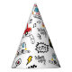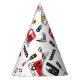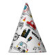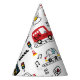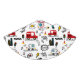 Ein spielerisches Stadtmuster im Cartoon-Stil mit Bussen, Autos, Hubschraubern, Ampeln, Gebäuden und lustigen Doodle-Texten wie „Beep Beep“, „Wuz Up?“ und „Los“, in leuchtenden Rot-, Gelb-, Blau- und Schwarztönen.