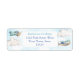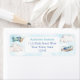 Flugzeug aus Aquarellspielzeug fliegen gegen einen blauen Himmel und flauschige weiße Wolken für diese niedlichen, verpackten Rücksendeadressen-Aufkleber, perfekt für einen Geburtstag, Taufe oder Babydusche.