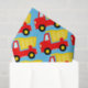 Farbenfrohe Spielzeugkipper Kindergeburtstag Geschenkpapier. Benutzerdefinierter Füller für Geschenke und Gastgeschenke für Kinder. Trendy Party-Zubehör und Heimwerkerzubehör für lustige Geburtstags- oder Babyduschfeiern etc. Anpassbare Hintergrundfarbe hinter dem roten LKW-Muster. Darstellung von Baufahrzeugen für Jungen.