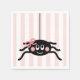 Eine bezaubernde Spinne mit rosa Wangen trägt ein niedliches und gürtelhaftes Band, das in einen Bogen gebunden ist und von der Oberseite eines rosa und weiß gestreiften gemusterten Hintergrunds hängt. Genauso niedlich für ein Halloween oder Itsy bitsy Spinnentheater Geburtstagsfeier. Artwork © Chrissy H. Studios, LLC. Alle Rechte vorbehalten.