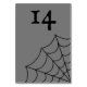 Erstellen Sie individuelle Tischnummern für gotische Hochzeiten. Diese Karte kann mit Ihrer eigenen Nummer angepasst werden. Es zeigt eine Spiderweb-Grafik in der unteren Ecke. Schwarzer Text und Grafik sind Set auf grauem Hintergrund.