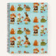 A spiral-bound notebook features a playful pattern on a light blue background. The design includes children in animal costumes, colorful mushrooms, a rabbit, and picnic baskets. The cheerful illustration conveys a whimsical, outdoor adventure theme.