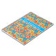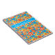 Ein Spiralheft oder eine Zeitschrift mit einem rundum roten, orangefarbenen, gelben Blumenmuster auf einem hellen türkisfarbenen Hintergrund, aus einer handbemalten PapierCollage von Judy Adamson.