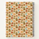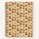 Spiral notebook with a vibrant cover featuring a pattern of colorful coffee cups, teapots, and plants on a beige background. Both front and back views.