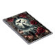 This image shows a landscape inspired by the Gothic aesthetic, combining dark tones, dramatic contrasts, roses and decorative details. In the center of the picture is a mystical castle in the light of the full moon, a cemetery in the foreground and red roses framing the view. The black birds flying in the background add a dark atmosphere to the scene.