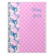 Ein hübsches und feminines Spiralbuch für Tagebuch oder Tagebuch mit einem Muster aus hellrosa Rosen auf dunkelblauem Hintergrund und rosa-weiße Polka-Punkten.