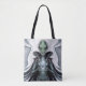 Diese Tüte besticht durch eine Alien in Kontemplation, bei der über beiden Händen ein schimmernder Kristall schwingt. Egal, ob Sie in der Bibliothek sind, Einkäufe tätigen oder auf Abenteuer gehen, diese Tasche fügt jedem Look eine mystische, stilvolle Touch hinzu.