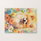 Farbenfrohe Aquarellbilder eines Spitzes, der auf einem Feld von Frühlingsblumen sitzt.