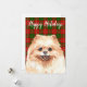 Urlaubskarte mit Aquarellbildern von Spitz Hund auf festlich grünem und rotem kariertem Hintergrund und individualisierbarem Holiday Gruß.