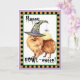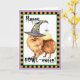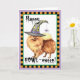 Senden Sie Halloween-Grüße mit dieser Karte eines niedlichen Spitzes, der einen Hexehut trägt, der mit einer albernen Spinne verziert wird. Groß für Kinder alles Alters das Liebe Poms und Halloween. Haben Sie ein glückliches Heulen-oween!