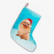 Spitz Hund sitzend am Weihnachtshut am Strand Kleiner Weihnachtsstrumpf