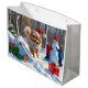 Spitz läuft im Schnee mit Weihnachtshut Große Geschenktüte