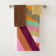 Dieses Set ist mit einem bräunlichen Waschtuch, einem braunen Handtuch und einem Badetuch mit Retro-Design aus den 70er Jahren aus einem dreiseitigen, auf dem Kopf liegendem Vs in Retrofarben.