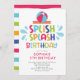 Farbenfrohe Girls Splish Splash Pool Party Geburtstag Einladung mit einem koordinierenden kühnen Streifen zurück für eine besondere Touch.