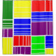 Dieser Duschvorhang hat ein Bauhaus-Design von Rechtecken, unterteilt in immer kleinere Teile in rot, gelb, blau, grün, lila auf einem Feld von Weiß.