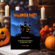 Zwei-seitige Postkarten-Halloween-Party-Einladung mit einem Spuk, schwarzen Haus, Fledermäusen, Grabsteinen und Blitz an einer stürmischen Dunkelnacht. Orangefarbener "Halloween-Party"-Text. Passen Sie die Party-Details auf beiden Seiten an und personalisieren Sie sie. Diese Postkarte ist spukhaft, gruselig, cool und lustig.