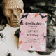 Niedliche Hälfte der Geburtstagsfeier-Einladung eines Mädchens mit der Illustration eines Geisters, einer schwarzen Katze, Spinne, Fledermaus, Bonbons und Kürbisse. Im Text steht "schließen Sie sich uns für eine Spooktacular Geburtstagsparty an."