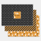 Wrap deine Halloween Goodies und Geschenke in diesen lustigen Packpapier-Blätter mit spooktacular Muster. Eines ist schwarz mit einem Muster aus kleinen weißen Sternen und einem Etikett, dem man seinen Namen hinzufügen kann, umgeben von einem Geist, einer Fledermaus und Spinnen. Die Streifen sind schwarz, weiß und orange. Und eine zeigt ein lustiges Muster von Geistern, Fledermäusen und Knochen in Schwarz, Orange und Weiß.