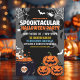 Lindo diseño de fiesta de Halloween con la frase divertida "SPOOKTACULAR HALLOWEEN PARTY" este diseño cuenta con colores naranjas, grices y negros con ilustraciones tipicas de Halloween, el diseño cuenta con todos los datos a personalizar para tu fiesta de Halloween.