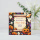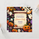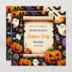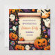 Das Design verfügt über einen Bildlauf in der Mitte über ein älteres Pergament, das einen Leerraum für Text bietet. Um die Schriftrolle herum befinden sich verschiedene Halloween-Symbole, darunter Lächeln von Jack-o’-Laternen, Geister mit verschiedenen Ausdrücken, Bonbons, Halloween-Lolli, schwarze Spinnen und Fledermäuse. Der Hintergrund ist sehr lila mit subtilen Sternmustern und schafft eine spielerische und sprichwörtliche Atmosphäre, die perfekt zu Halloween passt.