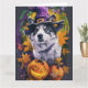 Mit diesem bezaubernden Design, das einen niedlichen Hund in einer Hexe mit geschnitzten Kürbissen schmückt, können Sie das Halloween-Ambiente genießen. Ideal, um Ihren Festlichkeiten eine Touch von spötlichem Charme zu verleihen.