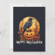 Diese Einladung zum Halloween-Party zeigt eine Abbildung einer schwarzen Krähe mit Stöcken. Diese festliche Einladung kann leicht bearbeitet werden, um zu zeigen, wann, wo und eine kurze Liste von Halloween-Bash-Details, die Sie anpassen können, um diese Karte ganz persönlich zu machen.