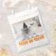 Das Design ist ein sprichwörtlich graues, flauschiges Kätzchen, das einen Hexenhut trägt, während Fledermäuse herumfliegen. Leckerei Tasche sagt Trick oder Treat! Nachricht sagt "Happy Halloween from the Syth Family" Klicken Sie auf die Schaltfläche Personalisieren, um die Nachricht anzupassen.