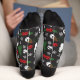 Dieses Muster bietet traditionelle Weihnachtsmotive mit Schneeflocken und Sternen, die aus weißen Skelettknochen, Schädelsschmuck und heiligen Beeren, schwarzen, sprichwörtlichen Weihnachtskränzen und Bäumen, Ghulischen Ornamenten und Schneemännern bestehen. Meine Abbildungen in Weiß, Schwarz, Grau und Rot sind Set auf schwarzem Hintergrund. Diese Socken sind also perfekt für jeden, der will, in den Weihnachtsgeist zu kommen, aber nicht ganz bereit ist, sich von Halloween zu verabschieden.