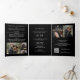 Part of a complete wedding stationery collection, this card is available in multiple formats and paper types, offering a professional finish that enhances the intensity of colors and the mysterious atmosphere of the design. The tri-fold format organizes the information clearly and elegantly, integrating up to six photos that capture the couple’s most special moments, providing a complete and visually appealing presentation.