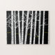 Puzzle zeigt einen weißen Birkenwald und beängstigende, schwarze Augen, die zwischen den Bäumen auf einer gruseligen, dunklen, schwarzen Nacht ausblicken. In diesen Wäldern gibt es keine niedlichen Vögel oder Hirsche, nur Monster. Neu, lustig, humorvoll, originell, klassisch. Zu einem glücklichen Halloween-Urlaub, Oktober, Herbst oder zu jeder Jahreszeit. Für Kinder und Erwachsene. Für Halloween-Partys.