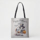 Dieses Halloween-Tüte ist mit einer niedlichen, gotischen Cartoon-Illustration versehen. Ein Bild eines Jungenskeletts mit einem Oberhut und einer Anzug-Jacke sowie eine kleine Porzellanpuppe für Geistermädchen sind unten abgebildet. Ein paar niedliche Fledermäuse überfliegen sie, während sie die Nacht mit ihren Jack- oder Laternen durchlaufen. Ein "Happy Halloween"-Gruß wird in einem eleganten Script-Schriftart auf der Oberseite des Totensacks gedruckt. Der Hintergrund weist ein verblasstes Schattendesign auf.