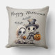 Dieses Halloween-Kopfkissen zeigt eine spukhafte und niedliche, gotische Cartoon-Dekoration. Ein Bild eines Jungenskeletts mit einem Oberhut und einer Anzug-Jacke sowie eine kleine Porzellanpuppe für Geistermädchen sind unten abgebildet. Zwei niedliche Fledermäuse fliegen über ihren Köpfen, während sie ihren Jack oder ihre Laternen durch die Nacht tragen. Ein "Happy Halloween"-Gruß wird auf dem Kopfkissen in einem eleganten Script-Schriftart gedruckt. Der Hintergrund weist ein Schattenmuster auf.