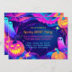 Dieses Halloween-Party lädt zu einem bezaubernden und skurrilen Design ein, das sich ideal für Kinder eignet. In der Mitte stehen zwei bezaubernde Geister, die mit freundlichem Lächeln fröhlich schweben. Die Geister sind von einer lebhaften und spielerischen Farbmischung umgeben - hauptsächlich Blau, lila und Rosa - und schaffen so eine magische Atmosphäre. Der Hintergrund ist ein Farbverlauf dieser Farben, der sich harmonisch vermischt, um eine lebendige, auffällige Kulisse zu schaffen. Der Text "You’re Invited to a Spooky GHOST Party!" wird in einem lustigen, skurrilen Schriftart, der zum spielerischen Thema der Einladung passt, prominent dargestellt. Der Text ist umgeben von fröhlichen Kürbissen mit leuchtenden, ausdrucksvollen Gesichtern und kuscheligen Fledermäusen, die das festliche und sprichwörtliche Ambiente noch verstärken. Das gesamte Design ist voll von lebendigen Elementen, darunter funkelnde Sterne und subtile Glitzern, die das magische Ambiente verstärken. Die Kombination aus Blau, lila und Rosa verleiht dem Ganzen ein traumhaftes und lebendiges Aussehen und eignet sich perfekt für ein KinderHalloween-Event. Die Rückseite der Einladung setzt sich mit dem gleichen lebendigen Hintergrund fort und bietet zusätzlichen Platz für UAWG oder zusätzlichen Text bei gleichzeitiger Beibehaltung des spielerischen und magischen Themas. Dieses Design spiegelt den fröhlichen und freundlichen Charakter von Halloween wider und macht es zu einer angenehmen Wahl für ein kinderfreundliches Halloween-Party.
