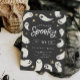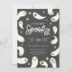 Moderne und skurrile Einladungskarte mit handgeschriebenem Typografentext in der Mitte, auf der steht: "Lasst uns Spaß haben". Illustration niedlicher Geister mit Sternen.