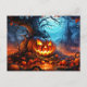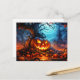 Diese spoktakuläre Postkarte besticht durch einen glühenden Jack o' Laterne vor einem Spuk Mondhaus.
