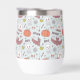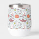Dieses Design ist ein Halloween-Motiv mit einem skurrilen und spielerischen Design. Die Hintergrundfarbe ist weich pastellblau und mit verschiedenen Halloween-Icons und Symbolen gefüllt.