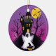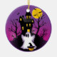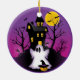 Spooky Halloween Geist vor seinem Spuk Haus mit Spinnennetzen, Kürbis und Fledermäusen fliegen im sonnigen Himmel.