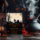 Bereiten Sie sich mit diesem tollen Halloween-Design auf eine überwältigend gute Zeit vor. Set vor einem schattigen Hintergrund, die Silhouette eines Friedhofs mit gruseligen Bäumen und Grabsteinen schafft eine kühle Atmosphäre. Glühender flüchtige Blick von unten, um eine zusätzliche Touch von unheimlichem Charme. Ideal, um die Szene für Ihren Halloween-Bash zu setzen!