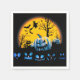 Halloween-Servietten mit dem Bild eines Nachthimmels mit Vollmond und Hexe und Fledermäusen. Im Vordergrund sind Kürbisse in blauem Licht und eine Katze, die über alles wacht.