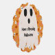A cute hand drawn illustration of festive blend of ghosts and pumpkins on a vibrant orange background, evoking a playful Halloween spirit.