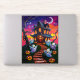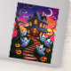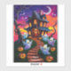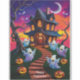 Entdecken Sie diese bezaubernde Halloween-Illustration mit einem spurigen Spuk Haus unter einem Halbmond, umgeben von Kürbissen und einem geheimnisvollen Pfad. Ideal für Halloween-Liebhaber!