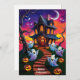 Entdecken Sie diese bezaubernde Halloween-Illustration mit einem spurigen Spuk Haus unter einem Halbmond, umgeben von Kürbissen und einem geheimnisvollen Pfad. Ideal für Halloween-Liebhaber!