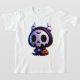 Diese kollektive Figur verbindet Elemente von Spott und Kulanz. Es verfügt über ein stilisiertes Skelett mit einem übergroßen Kopf, das einen schwarzen Umhang mit Hörnern trägt. Die Figur hat große, hohle Augen und ein weißes Schädelgesicht mit Schmelzwirkung. ein kleiner orangefarbener Kürbiskorb, der an Halloween-Trick oder -Behandlung erinnert.