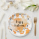 Niedliche Halbzeitfeier mit der Geburtstagsparty eines Designermädchens, in der die geisterhaften Geister auf orangefarbenem Wasser mit einem schwarz-weiß-ghost-Muster dargestellt werden. Im Text steht "GLÜCKLICH HALLOWEEN". Original-Kunstwerk von Caroline Bonne Müller