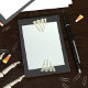 Ein skelettartiges Skelett mit einem leeren Schild auf einem schwarzen Hintergrund. Ideal für deine gruseligen Halloween-Klebrigen.