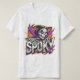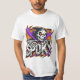 Dieses lebendige Design zeigt einen unheilvollen Skelettcharakter, der aus dem fetten, stilisierten Text "SPOOKY" hervorgeht. Das Skelett trägt mit einem breiten Grinsen und ausdrucksstarken Augen einen dramatischen lila Umhang, der um seine Schultern fließt und sein unheimliches und dennoch spielerisches Verhalten verstärkt. Der Text ist in dynamisch weiß mit gezackten Kanten, umgeben von einer auffallenden orangen und lila Kontur, die der Gesamtkomposition Tiefe und Energie verleiht. Die Farbenmischung und das Comic machen dieses Design perfekt für ein Halloween-Thema, das ein Gefühl von Spaß und Frohsinn verkörpert.