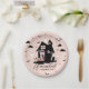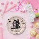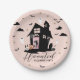 Fun Halloween Themenparty Teller. In unserem Design finden Sie ein Sporthaus mit einer Türe mit einem Foto-Platzhalter, um Ihr eigenes Halloween-Foto zu zeigen. Fliegende schwarze Fledermäuse und pinkfarbene, spukhafte Geister verstärken das Halloween-Thema weiter. Zu Halloween-Tellern gehören Fledermäuse, Fensterscheiben, Geister, Wolken und Texte für ein einzigartiges und unterhaltsames Design. Designed by Moodthology.