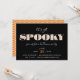 Die Einladungen zum Halloween-Party und zum Festspiel "Lasst uns spukhaft werden" in dekorativer orangefarbener und weißer Typografie auf einem schwarzen Hintergrund. Passen Sie Ihre Halloween-Party-Details unten an. Einladungen kehren zu einem orangen und weißen geometrischen Muster zurück.