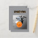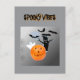 Diese Postkarte mit einem Halloween-Thema zeigt ein kühn gestaltetes Frontsystem mit einem großen orangefarbenen Kürbis, einem blauen Geist, einem gruseligen Baum, fliegenden Fledermäusen und einem strahlend hellblauen Mond - alles Set vor einem weichen grauen Hintergrund. Die Phrase "Spooky Vibes" erscheint im schwarzen Gatekeeper-Schriftart mit einem orangefarbenen Schlagschatten, der einen gotischen Flair hinzufügt. Auf der Rückseite enthält die Karte bearbeitbare Felder für eine personalisierte Halloween-Bash-Einladung, einschließlich Name, Veranstaltungsdatum, Uhrzeit und Ort des Gastgebers. Das Layout verlasst Platz für eine Rücksendeadresse- und Empfängeradresse und eignet sich somit hervorragend für das Versenden oder das manuelle Ausliefern von spokigem Party.